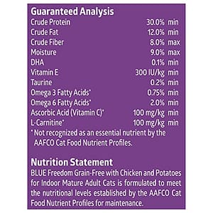 - GRAIN FREE MATURE FOOD: BLUE Freedom indoor mature cat food is formulated to help meet the unique needs of senior cats with reduced calories from fat to help maintain an ideal body weight and natural fiber sources to promote healthy digestion