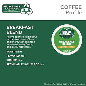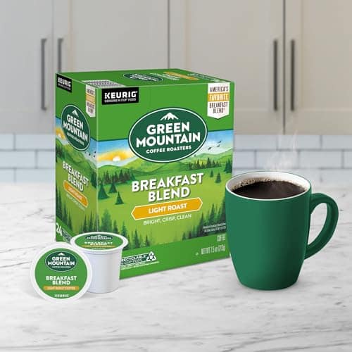Details: The mountains are a special place. It’s where Green Mountain Coffee Roasters was born. It’s where we developed our adventurous spirit and commitment to improving the lands through sustainably sourced coffee. We’re driven to bring the world a richer, better cup of coffee. Be bold. Be alive. Grab a cup and get out there. The Green Mountain Coffee Roasters Breakfast Blend is as eye-opening and delightful as the dawn itself. Clean and bright, with balanced sweetness, nutty flavor, and a silky mouthfeel. These single-serve K-Cup pods are compatible with all Keurig K-Cup Pod Single-Serve Coffee Makers. Each K-Cup pod is filled with the freshest ground coffee and brews a perfect, great tasting cup of coffee, every time. Certified Orthodox Union Kosher. What does being 100% responsibly sourced coffee mean? Responsibly Sourced means the coffee we purchase is grown and sold in adherence to a credible sourcing program that aligns with our company Responsible Sourcing Guidelines. Our coffee is 100% responsibly sourced. Introducing Recyclable* K-Cup Pods: Simple. Delicious. And now Recyclable. Enjoy the same great-tasting coffee you know and love, and when you’re done just peel, empty and recycle. *Check locally, not recycled in many communities. Packaging may vary. Great Lakes Coffee is a family business that spans generations. Over 60 years ago, they started as coffee farmers. Today, they’re transforming coffee and communities in Uganda by building a sustainable coffee program. And we’re with them every step of the way. We’re supporting their efforts to assist farmers and produce a premium-quality coffee by instituting better tracking practices and creating quality assessment labs right in their communities. Programs like this help raise the value of their coffee and improve the standard of living for farmers like Biira. All while you enjoy the smooth, balanced taste of Breakfast Blend.