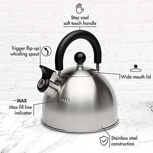 - EASY TO USE- This kettle will boil water in no time and features a flip-up whistling spout that easily opens when it’s time to pour.