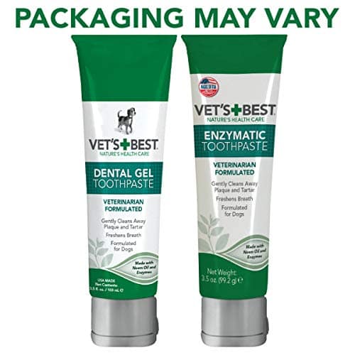 Details: Provide the best dental care for your dog with Vet’s Best Complete Enzymatic Dental Care Gel & Toothbrush Kit. Our veterinarian-formulated toothpaste contains enzymes and natural ingredients (including neem oil, grapefruit seed extract, baking soda, and aloe) that gently clean away plaque and tartar while freshening your dog’s breath. The kit includes our triple-headed toothbrush, which makes brushing quick and convenient. Three bristle heads are positioned to form around each tooth, efficiently cleaning from every angle simultaneously.